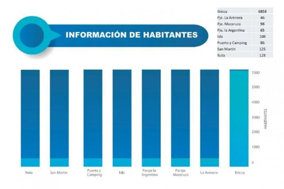 - IBICUY: 6858; - RUTA: 128; - SAN MARTÍN: 125, - ISLAS: 108; - PARAJE MAZARUCA: 98; - PUERTO Y CAMPING: 86; - PARAJE LA ARGENTINA: 65 y - PARAJE LA ARENERA: 46 personas.