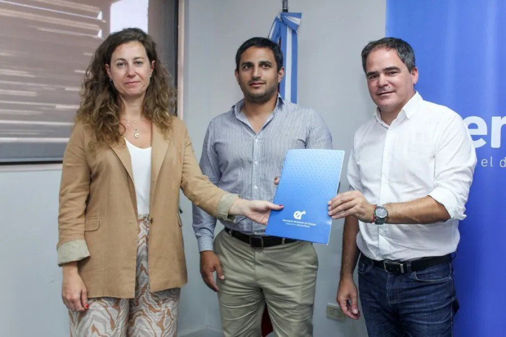 La secretaria de Energía, Silvina Guerra; el presidente de Enersa, Ramiro Caminos; y el intendente de Larroque, Leonardo Hassell, firmaron un convenio para la construcción de un nuevo tendido eléctrico que permita ampliar el existente en una zona industrial de la localidad.
