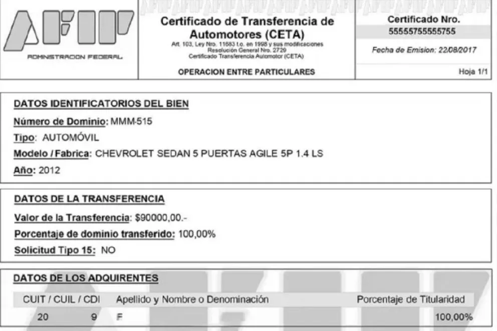 En cumplimiento de dichos objetivos, la AFIP eliminó la utilización del “Certificado de Transferencia de Automotores” (CETA) exigido para las operaciones de transferencia de vehículos automotores y motovehículos usados, lo que permite agilizar la operatoria de transferencia e inscripción de dichos bienes, atento a que el organismo cuenta con la información suficiente para asegurar la correcta declaración de los contribuyentes.