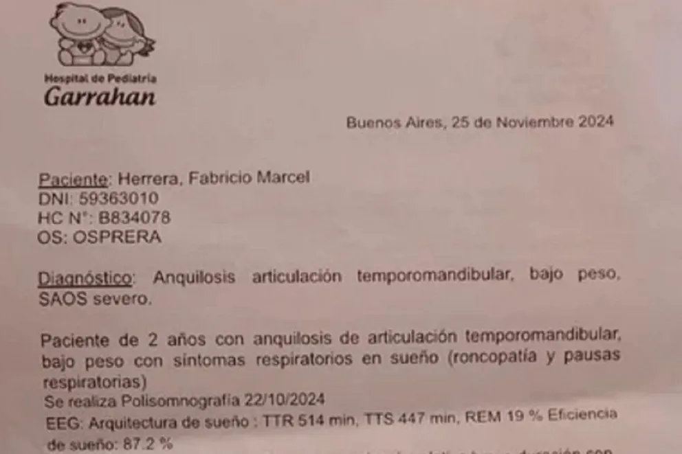 Fabricio Herrera, DNI 59.363.010. Es de Catamarca, tiene 2 años, diagnosticado con aniquilosis en la articulación termporomandibular y Síndrome de Apnea Obstructiva del Sueño (SAOS) severa. Es un trastorno caracterizado por episodios recurrentes de pausas completas o parciales de la respiración durante el sueño, desencadenando eventos respiratorios denominados apneas o hipopneas. La intervención de Osprera no le está entregando la aparatología que necesita para respirar cuando duerme.