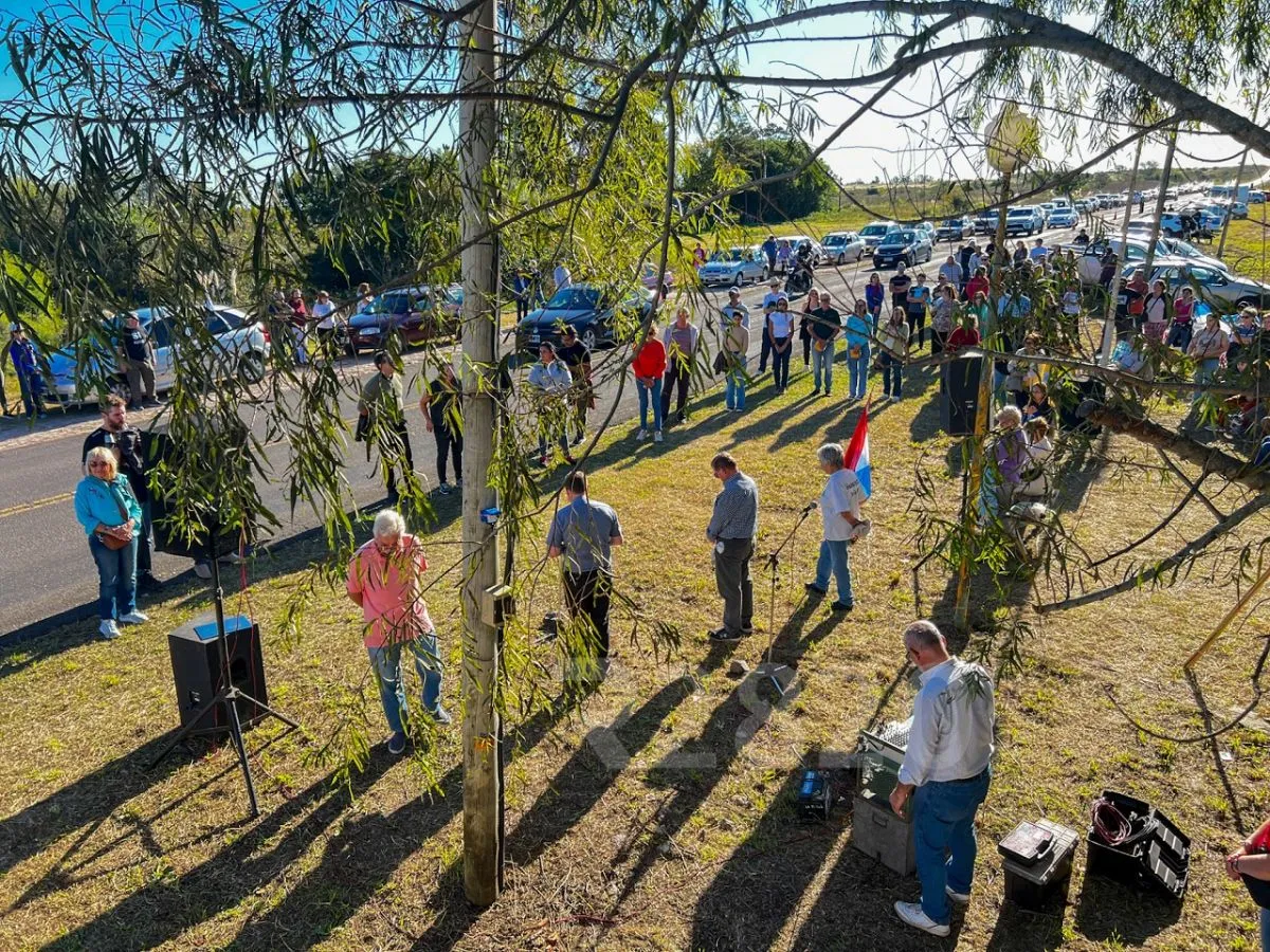 A las 16, sin interrumpir el tránsito, al costado de la ruta nacional 136, comenzó el acto con la lectura de adhesiones de asambleas ambientales de Córdoba, Misiones, Corrientes y La Rioja. Le siguieron los himnos de Argentina y de Uruguay y la oración ecuménica que llamó a “tener limpio el aire, el agua y la tierra”.