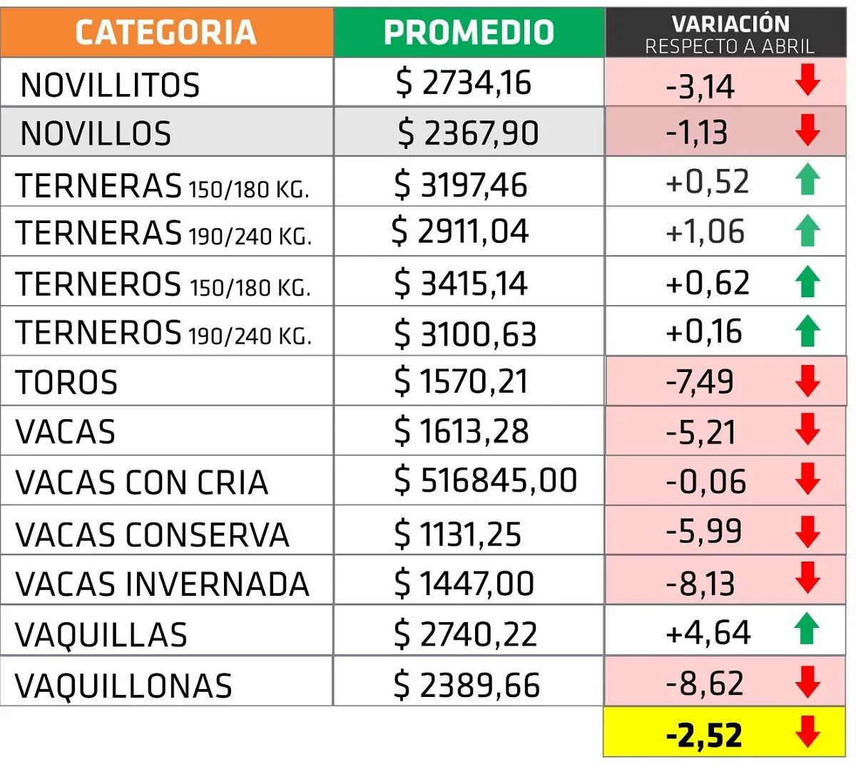 Así, los valores mostraron una leve baja durante el pasado mes, con una caída promedio del 2,52%. No obstante, la plaza se mantuvo básicamente estable, con algunas categorías que incluso mostraron signos positivos, como los terneros y las vaquillas, cuyos valores registraron incrementos.