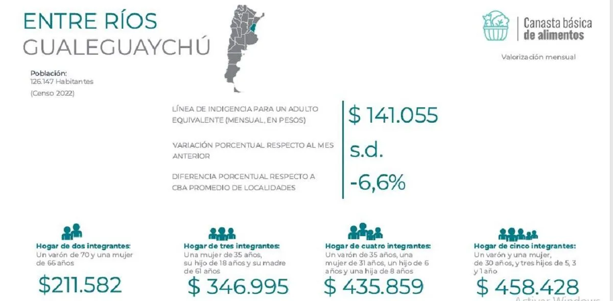 Los primeros resultados arrojaron que, sobre una población de 126.147 habitantes calculada con base en el Censo 2022, una persona adulta necesitó 141.055 pesos para no ser indigente y eso significa que la Canasta Básica Alimenticia es 6.6 por ciento más barata en Gualeguaychú que en el promedio nacional del INDEC.
