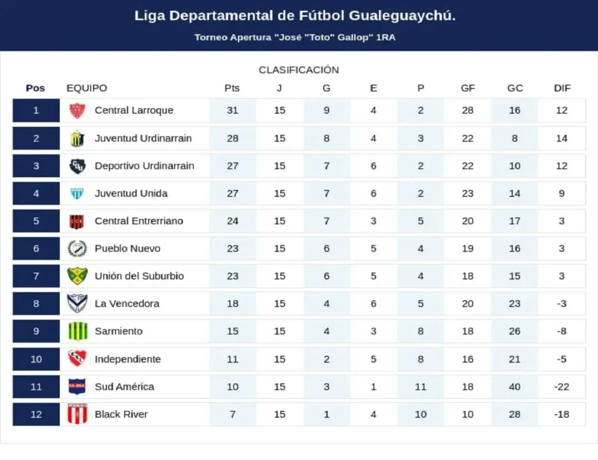 De esta forma, el certamen sigue siendo liderado por Central Larroque con 31 puntos, seguido ahora por Juventud Urdinarrain con 28, Deportivo y Juventud Unida 27, Central Entrerriano 24, Unión del Suburbio y Pueblo Nuevo 23, La Vencedora 18, Sarmiento 15, Independiente 11, Sud América 10 y Black River con 7 puntos.