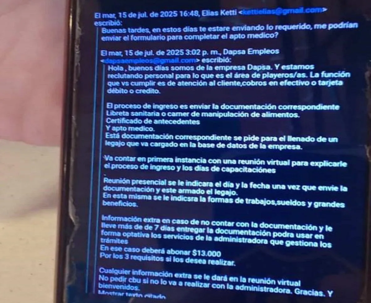 El falso aviso pide playeros para una estación de servicio y pide que se envié la postulación al correo [email protected]"Vos enviás el correo que figura en la publicación y te mandan una respuesta solicitando un pago de 13 mil pesos", detallaron.