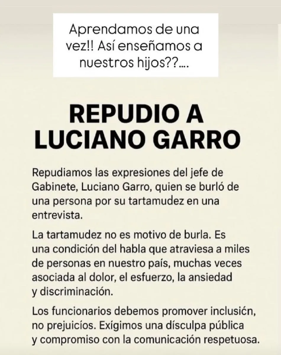 En ese marco, los concejales del PJ Gualeguaychú expresaron en las redes sociales su "repudio a Luciano Garro y a las expresiones del jefe de Gabinete, quien se burló de una persona por su tartamudez en una entrevista.
