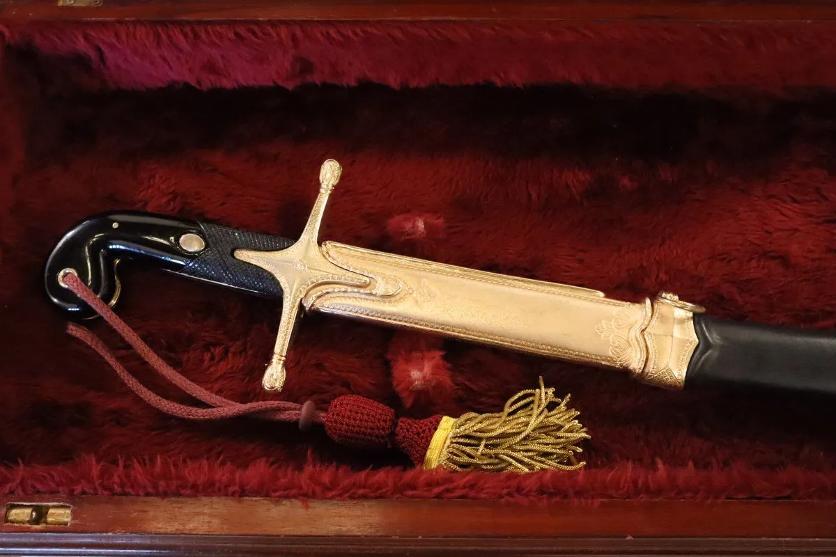 La historia de este sable remonta a 1811, cuando San Martín lo adquirió en Londres antes de embarcarse hacia el Río de la Plata. De origen árabe, fabricado en acero de Damasco con empuñadura de ébano y vaina recubierta en cuero y bronce, fue su arma de confianza durante toda las guerras de la Independencia.