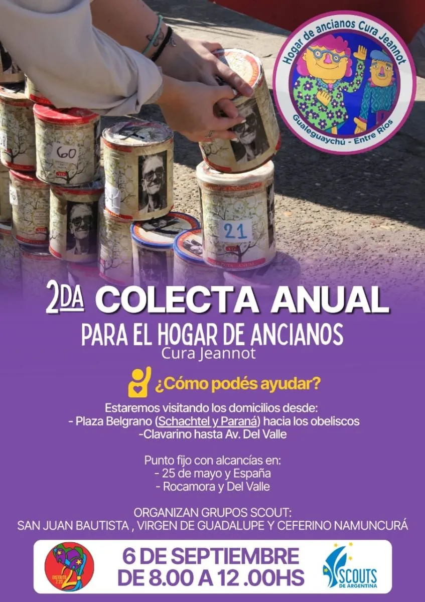 El próximo sábado 6 de septiembre, de 8 a 12 horas, los Scouts de Gualeguaychú concretarán la segunda Colecta Anual para el Hogar de Ancianos "Cura Jeannot".