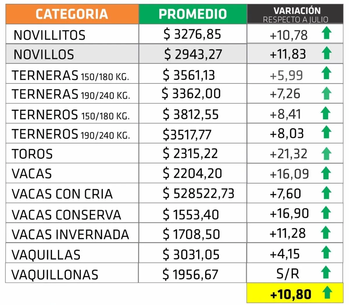 También registraron subas de relevancia los novillos (+11,83%), los novillitos (+10,78%) y los terneros de 150/180 kilos (+8,41%).