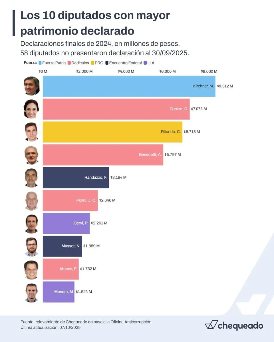 Máximo Kirchner (Fuerza Patria) tiene el mayor patrimonio declarado de toda la Cámara baja: $ 8.311 millones. Le siguen Carla Carrizo (Democracia para Siempre), con un patrimonio de $ 7.073 millones, y Cristian Ritondo (PRO), con $ 6.718 millones.
