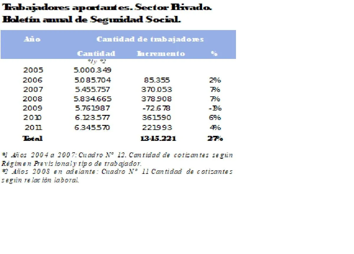En dicho periodo, y excepto por la interrupción en 2009 por la crisis subprime, los trabajadores aportantes al sector privado crecieron sostenidamente, totalizando un +27% al final de 2011.