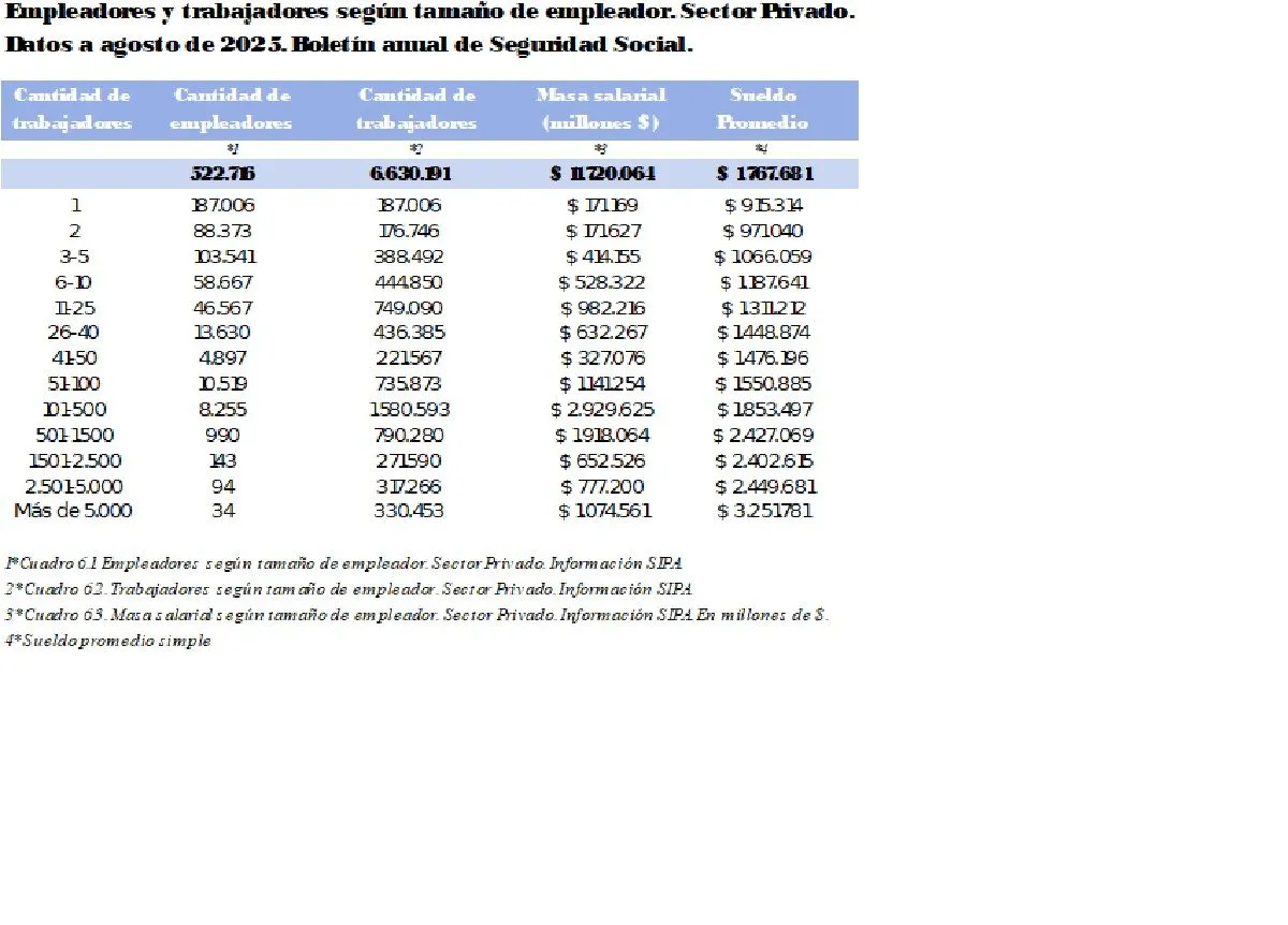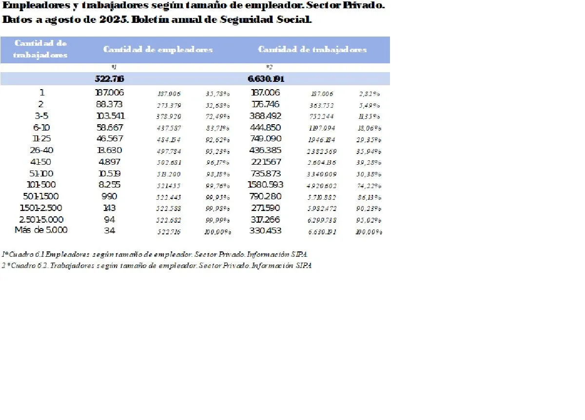 A agosto de 2025 existen en nuestro país 522.716 empleadores. El 84% de esos empleadores tienen registrados 1.197.094 trabajadores, el 18% del total.