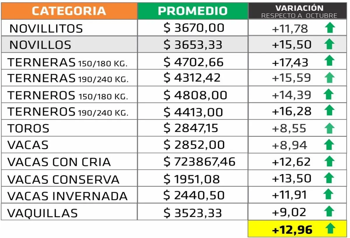 Según el informe, el mercado ganadero provincial experimentó un incremento promedio del 12,96% respecto de octubre, con un desempeño destacado en las categorías de invernada, que fueron las grandes protagonistas del mes.
