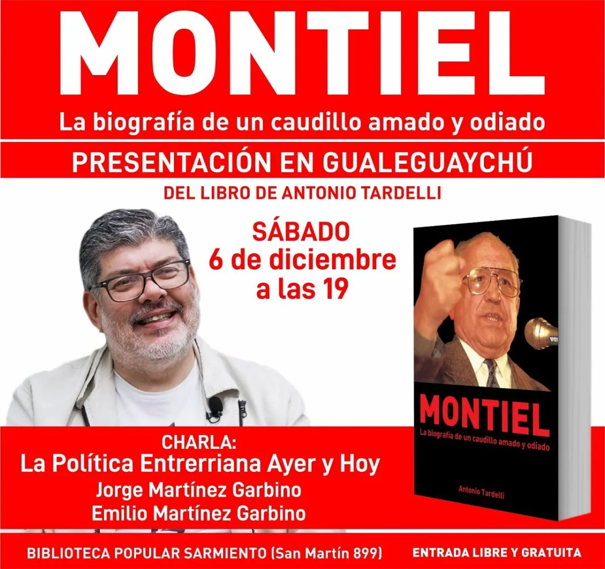 El periodista y escritor Antonio Tardelli presentará este sábado 6 de diciembre a las 19 horas, en la Biblioteca Sarmiento, la obra “Montiel, la biografía de un caudillo amado y odiado" trabajo que aborda la figura del dirigente entrerriano desde una mirada crítica, amplia y profundamente documentada.