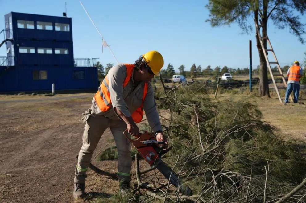 La Dirección de Espacios Verdes dispuso además un operativo sobre la arboleda implantada en el perímetro, ubicado a la vera de la Ruta Nacional 14, donde se realizó una poda de levante sobre ejemplares de casuarinas para mejorar su desarrollo y seguridad.
