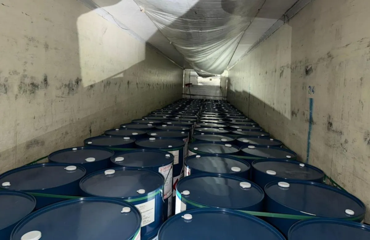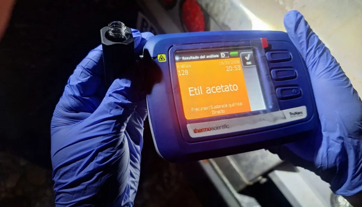 El resultado fue contundente: el primer camión transportaba 95 tambores de color azul y el segundo, 96. Los 191 tambores estaban identificados como "Acetato de Etilo", con un peso de 184 kilos cada uno, lo que arrojó un total de 35.144 kilos de sustancia. El Acetato de Etilo integra la Lista II de precursores químicos establecida por la Ley 26.045, lo que impone estrictos requisitos de habilitación, transporte y registro dado su carácter volátil e inflamable.