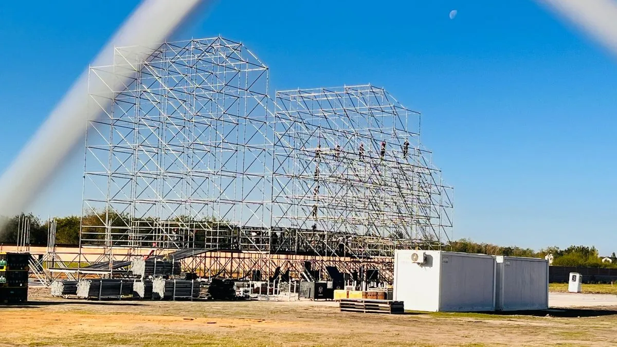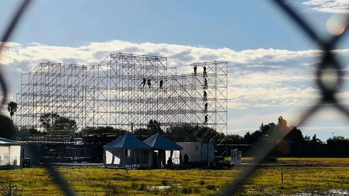 El sábado pasado comenzó el armado del megaescenario, con operarios trabajando a diario —incluso en fines de semana— para llegar en tiempo y forma. Se esperan miles de personas para el show.